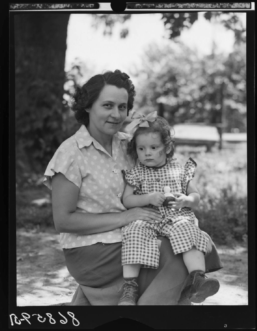 Madame Ls-Georges Biron et sa fillette. Saint-Elphège, comté Yamaska., 1951, Archives nationales à Québec, Fonds Ministère de la Culture et des Communications, (03Q,E6,S7,SS1,D2,P86859), Omer Beaudoin.
