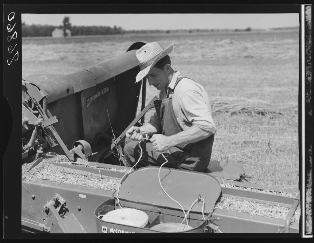 Presse à foin sur le champ de Ls-Georges Biron. Saint-Elphège, comté Yamaska., 1951, Archives nationales à Québec, Fonds Ministère de la Culture et des Communications, (03Q,E6,S7,SS1,D2,P86860), Omer Beaudoin.
