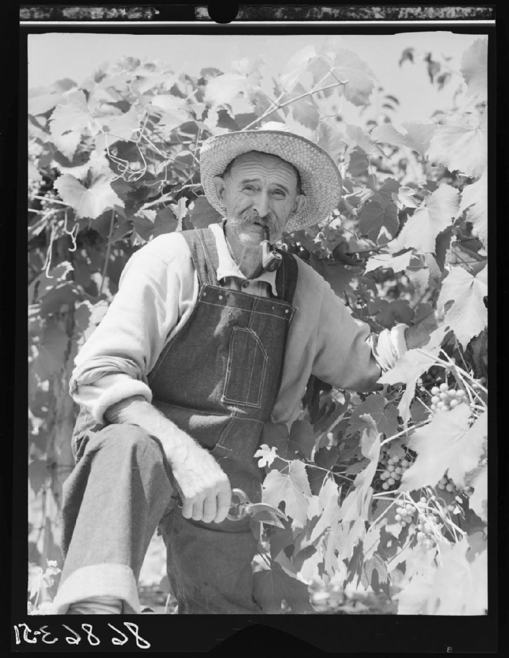 Le père de Ls-Georges Biron dans sa vigne. Saint-Elphège, comté Yamaska., 1951, Archives nationales à Québec, Fonds Ministère de la Culture et des Communications, (03Q,E6,S7,SS1,D2,P86863), Omer Beaudoin.