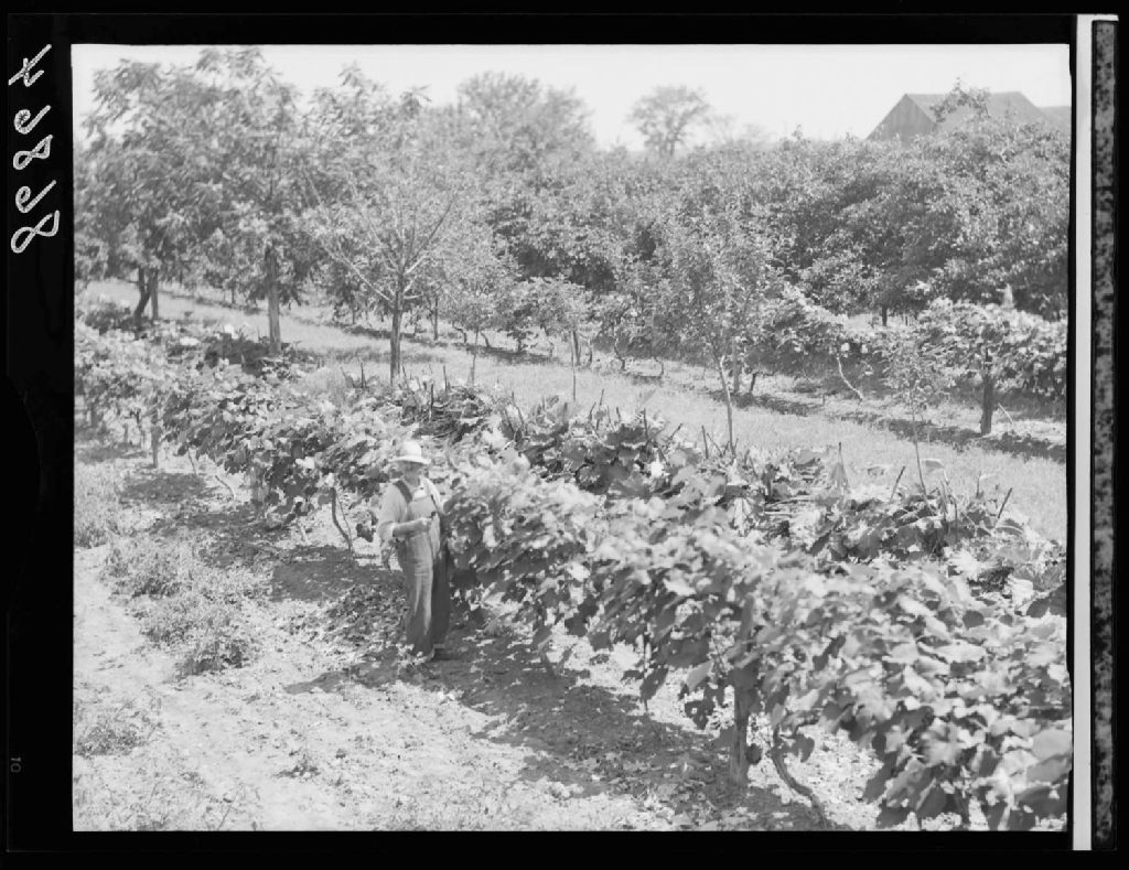 Le père de Ls-Georges Biron dans sa vigne. Saint-Elphège, comté Yamaska., 1951, Archives nationales à Québec, Fonds Ministère de la Culture et des Communications, (03Q,E6,S7,SS1,D2,P86864), Omer Beaudoin.
