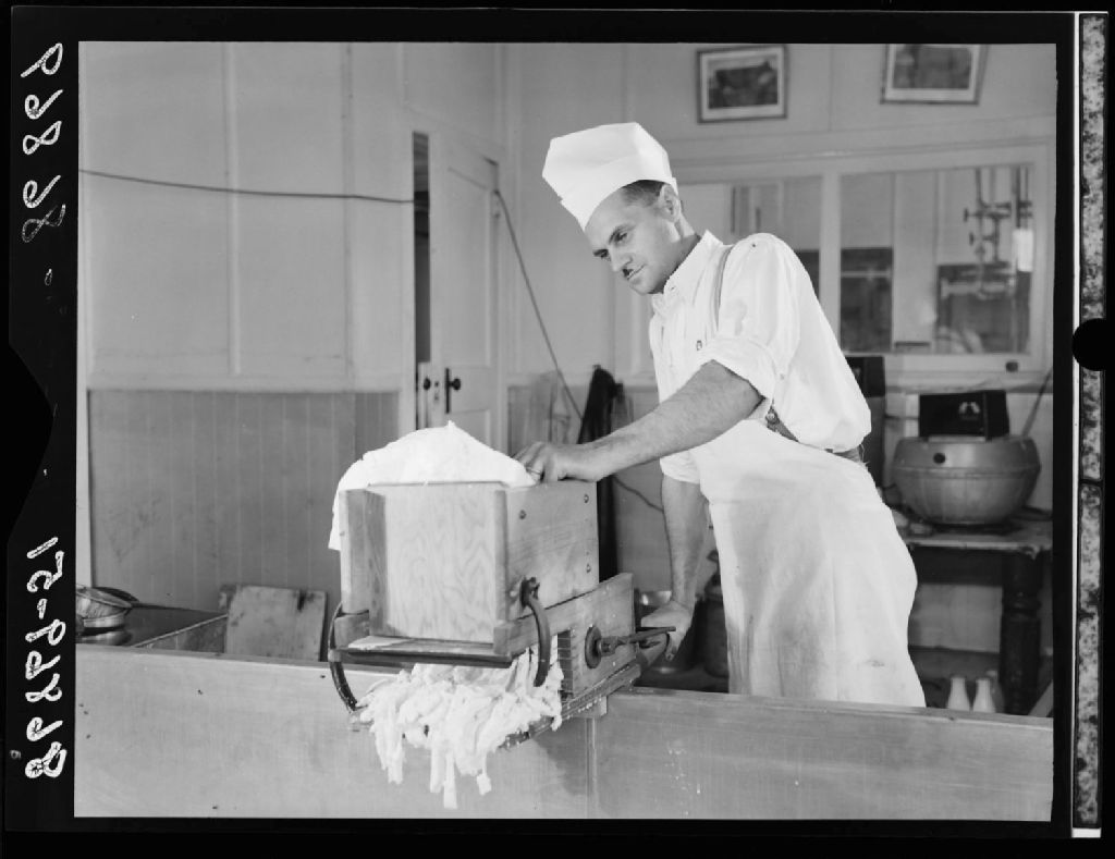 Le fromage est haché avant d'être mis en moule. Laiterie de Charlevoix, Baie-Saint-Paul.