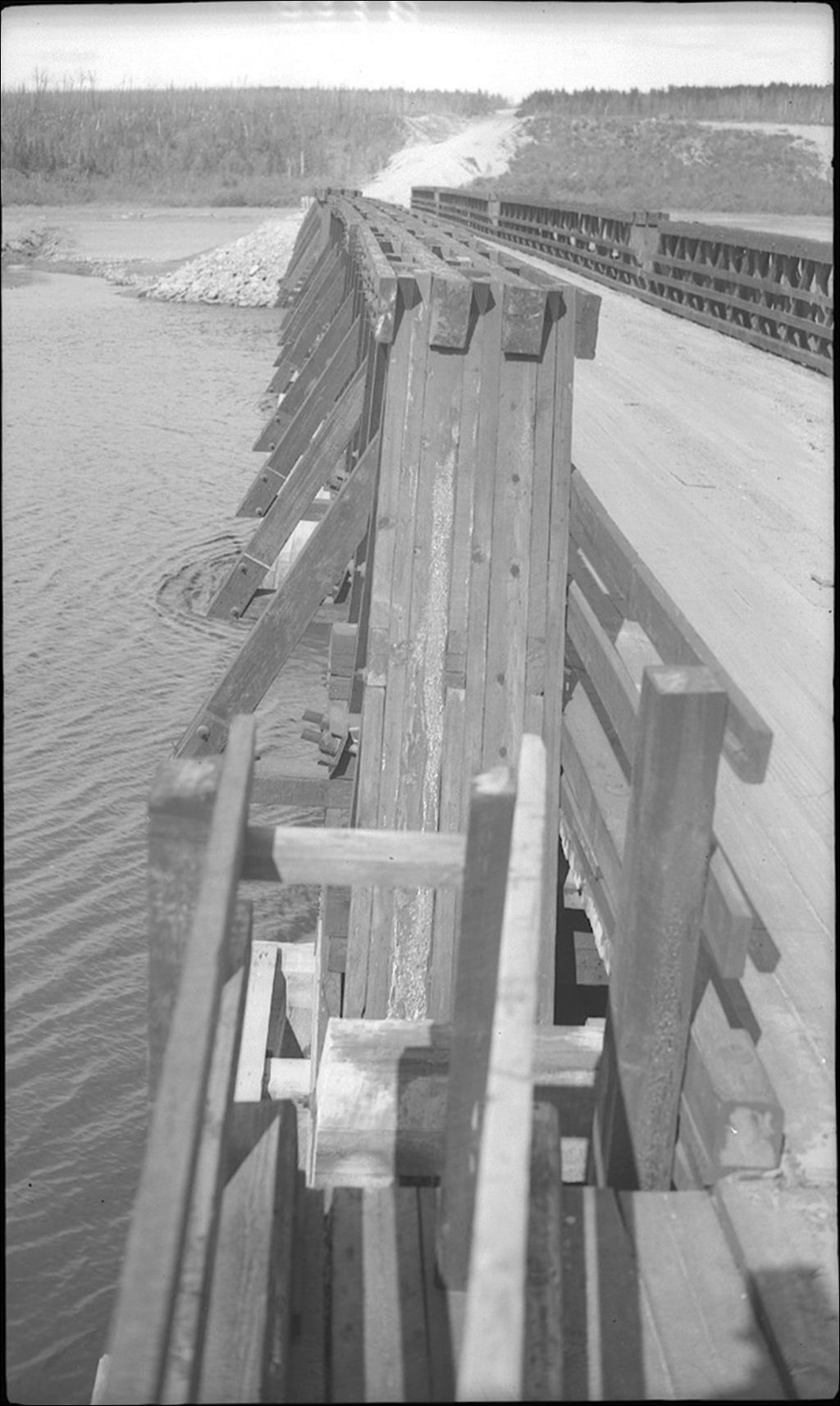 Pont sur la rivière Portneuf au Saguenay, 1942, Archives nationales à Québec, Fonds Ministère de la Culture et des Communications, (03Q,E6,S7,SS1,D2,P8705), J. Fournier.