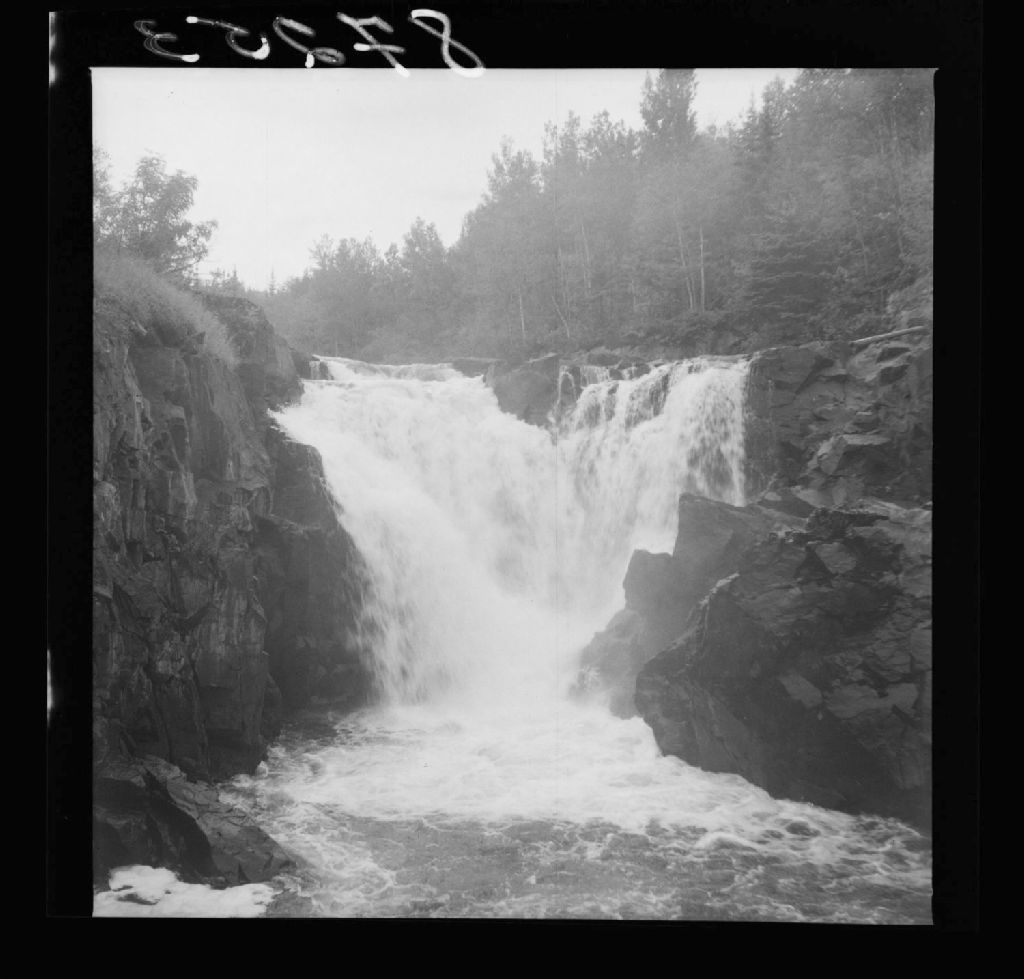 Les troisièmes rapides sur la Ouiatchouan en amont des chutes principales au droit de Val-Jalbert.. Val-Jalbert, Lac Saint-Jean, 1951, Archives nationales à Québec, Fonds Ministère de la Culture et des Communications, (03Q,E6,S7,SS1,D2,P87253), Auguste Mailloux.