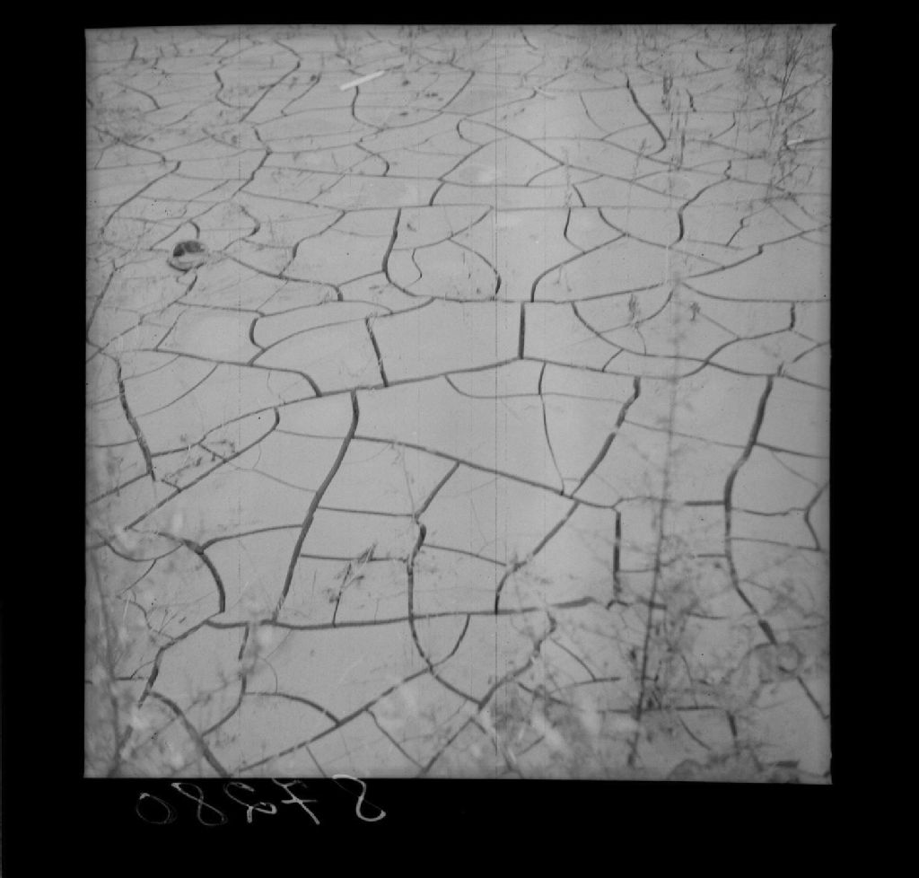 Dessication dans le limon argileux. Formes de retrait. Fissures du déssèchement de ce matériel fin entrainé dans les formes en creux par les eaux pluviales. Kénogami, comté Chicoutimi