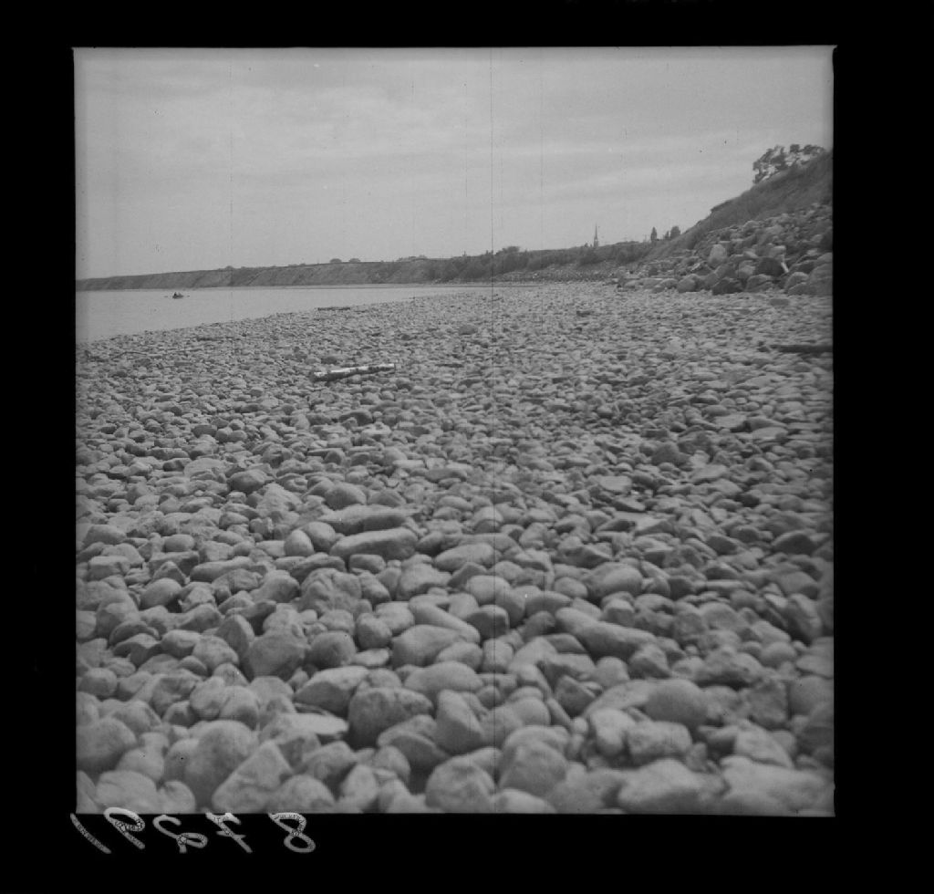 Plage de galets ou de cailloux roulés. Les cailloux ont en moyenne 4 à 6 pouces de diamètre, Desbiens, Lac Saint-Jean, 1951, Archives nationales à Québec, Fonds Ministère de la Culture et des Communications, (03Q,E6,S7,SS1,D2,P87291), Auguste Mailloux.