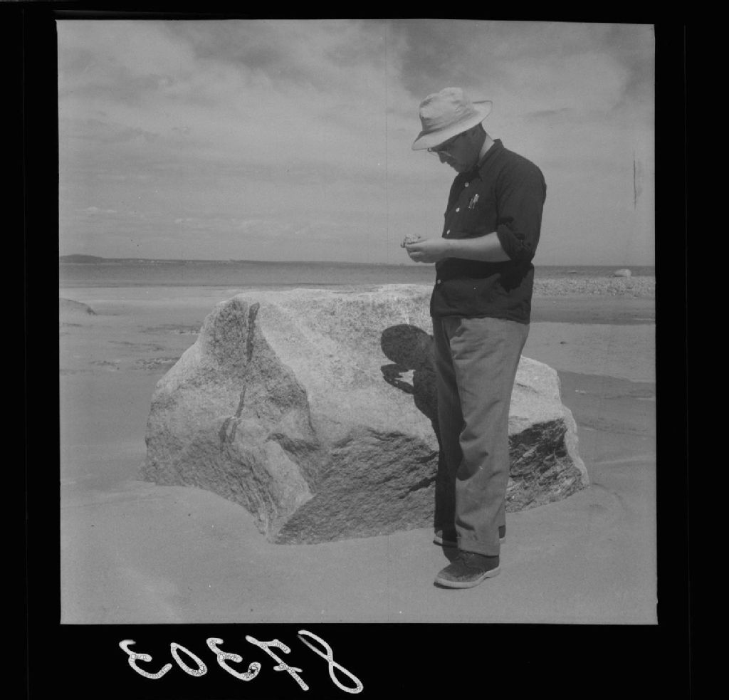 Cailloux transportés sur l'île par les glaces flottantes. Transport au printemps, lors de la fonte des glaces, de la terre ferme à l'île. Remarquer ses arêtes saillantes. À l'arrière Pointe-Bleue. Île-aux-Couleuvres, Lac Saint-Jean