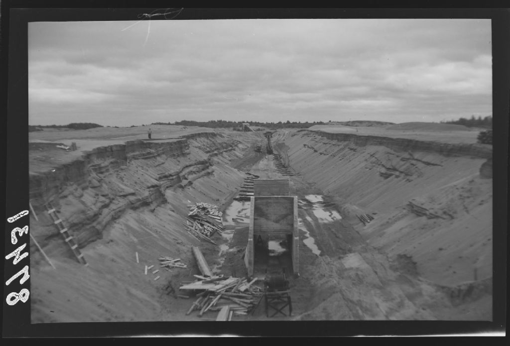 Exploitation de Lagravière de la Standard Lime. Construction d'un convoyeur sur courroie pour le transport du gravier vers la ligne du C.P.R. série de lourdes. Rang Saint-Frédéric, en bordure de la rivière l'Assomption , Notre Dame de Lourdes, Joliette