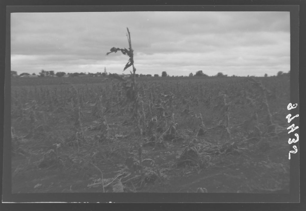 Rang III . Aspect lamentable d'un champ de tabac jaune après une tempête de grêle. Sainte-Mélanie, Joliette, 1951, Archives nationales à Québec, Fonds Ministère de la Culture et des Communications, (03Q,E6,S7,SS1,D2,P87435), Ernest Pageau.