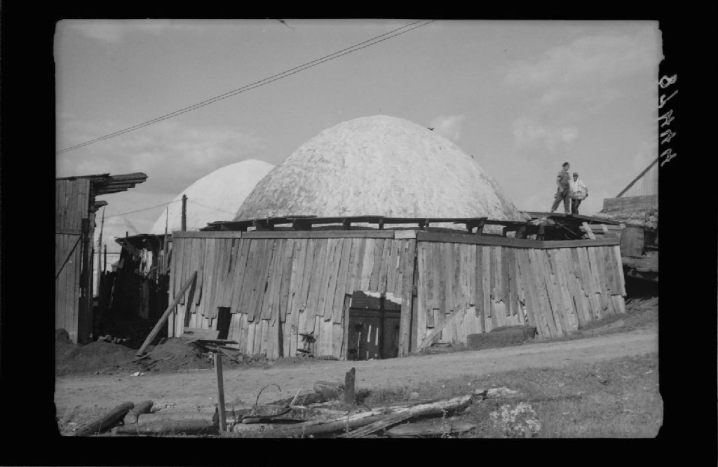 Four à charbon de bois. Four au premier plan; en brique avec revêtement de mortier d'une capacité de 65 cordes de 4 pieds. La Macaza, 1951, Archives nationales à Québec, Fonds Ministère de la Culture et des Communications, (03Q,E6,S7,SS1,D2,P87444), Roch Delisle.