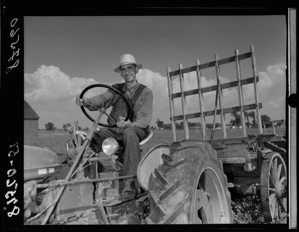 Hector Lemaire sur son tracteur. Saint-Bonaventure, comté Yamaska., 1951, Archives nationales à Québec, Fonds Ministère de la Culture et des Communications, (03Q,E6,S7,SS1,D2,P87560), Omer Beaudoin.