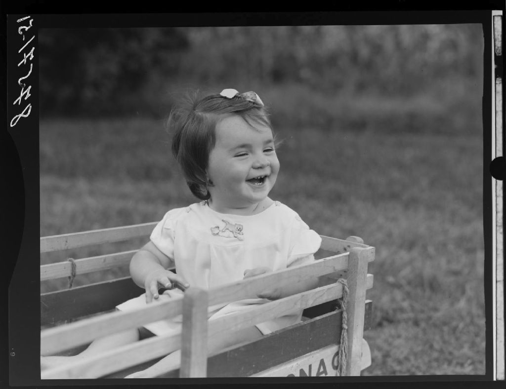 Bébé dans un wagonnet chez George Larocque. Bedford, comté Missisquoi., 1951, Archives nationales à Québec, Fonds Ministère de la Culture et des Communications, (03Q,E6,S7,SS1,D2,P87571), Omer Beaudoin.