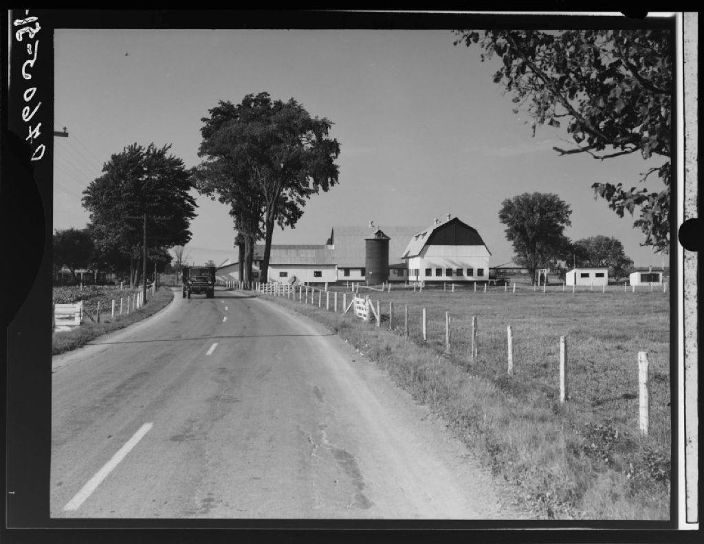 Bâtiments de ferme vers la route chez Ernest Bourgeois. Saint-Ours, comté Richelieu., 1951, Archives nationales à Québec, Fonds Ministère de la Culture et des Communications, (03Q,E6,S7,SS1,D2,P87605), Omer Beaudoin.
