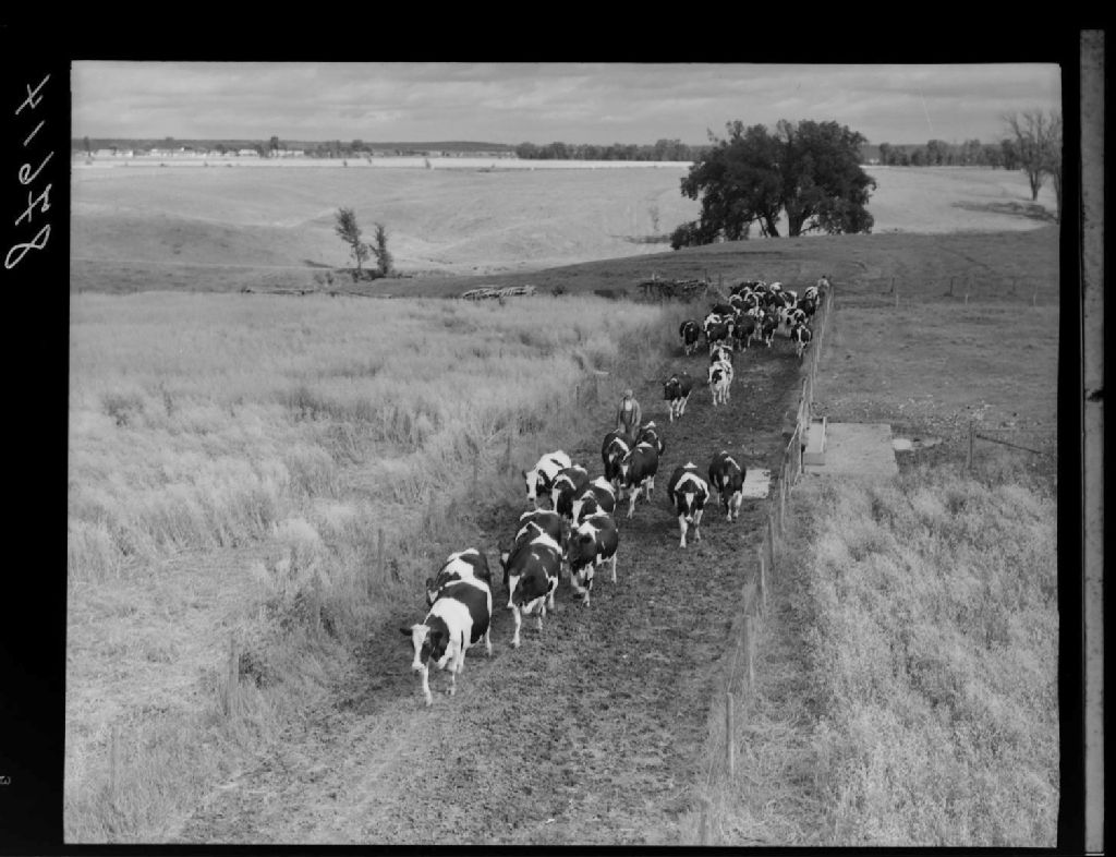 Troupeau revenant des champs à la métairie Saint-Joseph. La Providence, Saint-Hyacinthe., 1951, Archives nationales à Québec, Fonds Ministère de la Culture et des Communications, (03Q,E6,S7,SS1,D2,P87614), Omer Beaudoin.