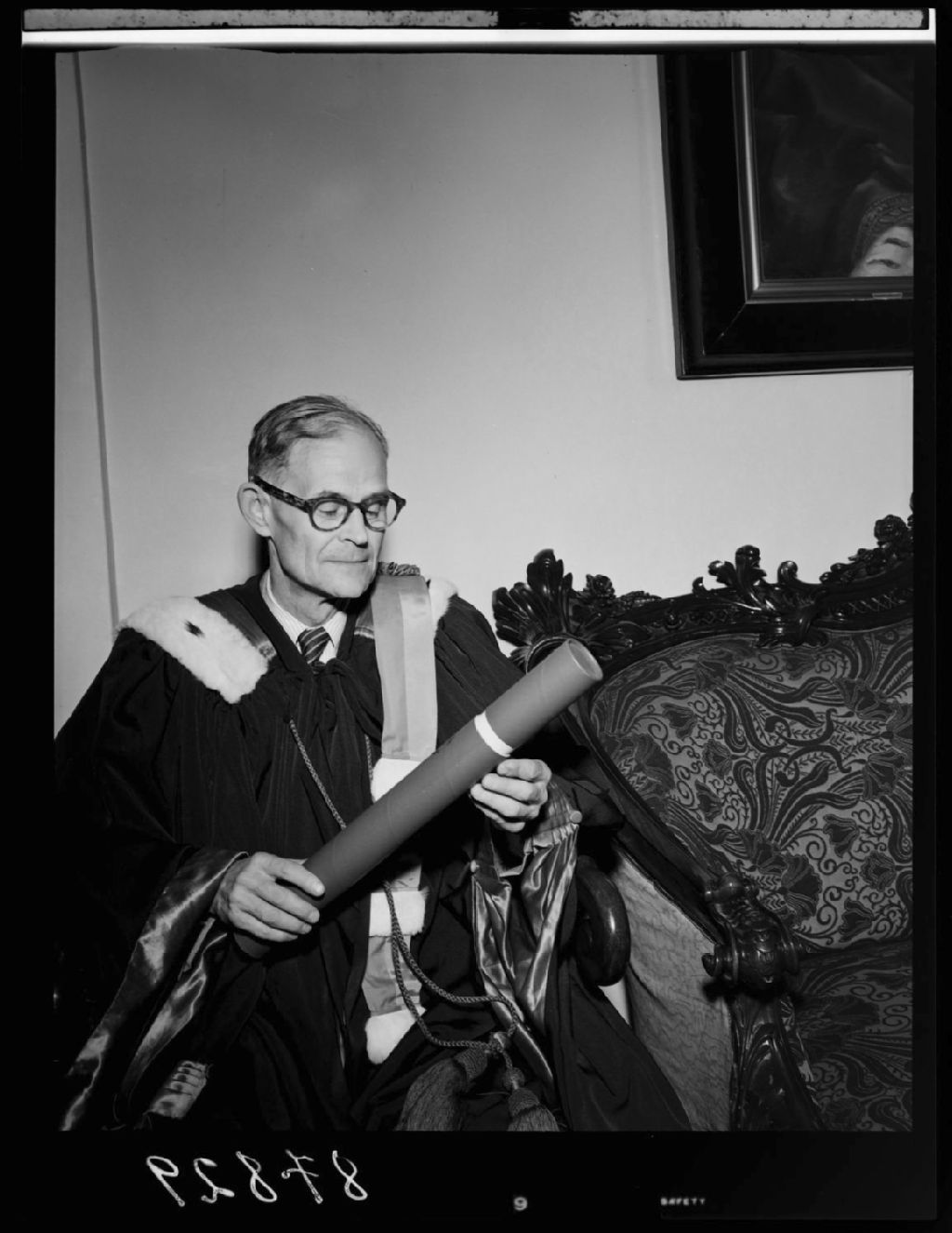 Monsieur Jean-Charles Magnan portant le insignes honorifiques du doctorat es-sciences agronomique que l'Université Laval vient de lui décerner