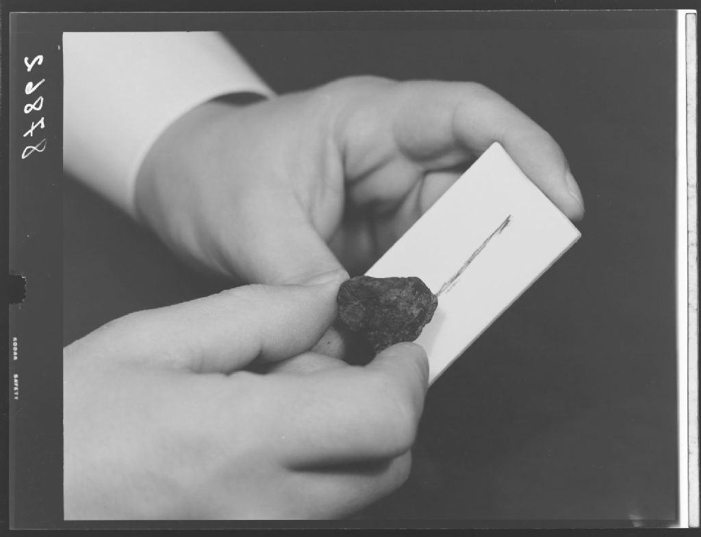 Marque d'un minéral sur un plaque de porcelaine au Laboratoire des mines, 1952, Archives nationales à Québec, Fonds Ministère de la Culture et des Communications, (03Q,E6,S7,SS1,D2,P87862), Neuville Bazin.