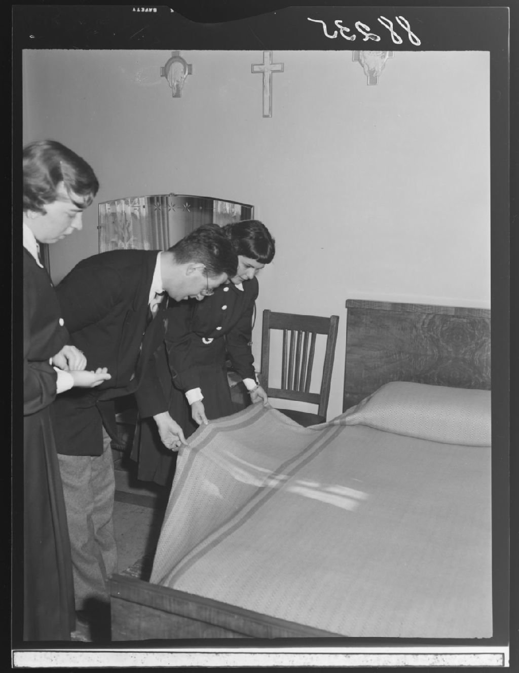 Visite d'une chambre d'élève. Présents: deux élèves et un inconnu, lors de la visite de mademoiselle Chamsi Mossaheb de l'Iran à l'École supérieure de Loretteville