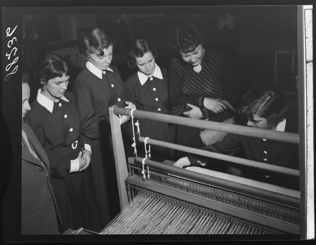 Classe de tissage. Quatre élèves, monsieur Noël et mademoiselle Chamsi Mossaheb de l'Iran à l'École supérieure de Loretteville