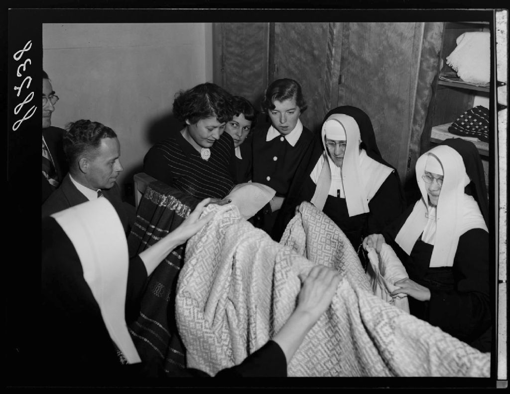 Catalognes, trois religieuses, deux élèves, monsieur Noël, et mademoiselle Chamsi Mossaheb, visiteuse de l'Iran à l'École supérieure de Loretteville