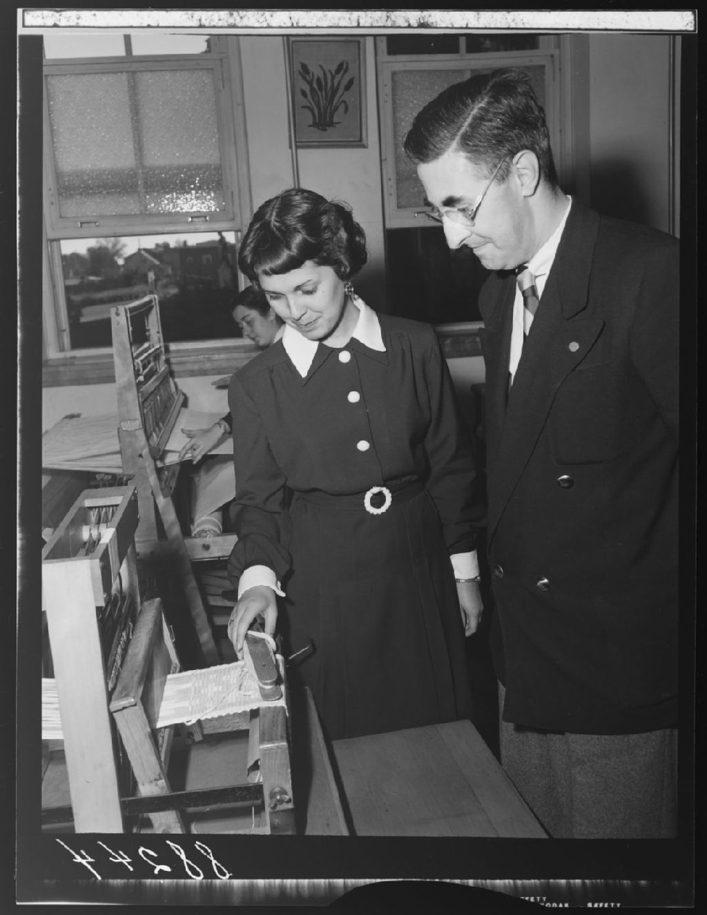 Classe de tissage. Un inconnu et deux élèves à l'École supérieure de Loretteville