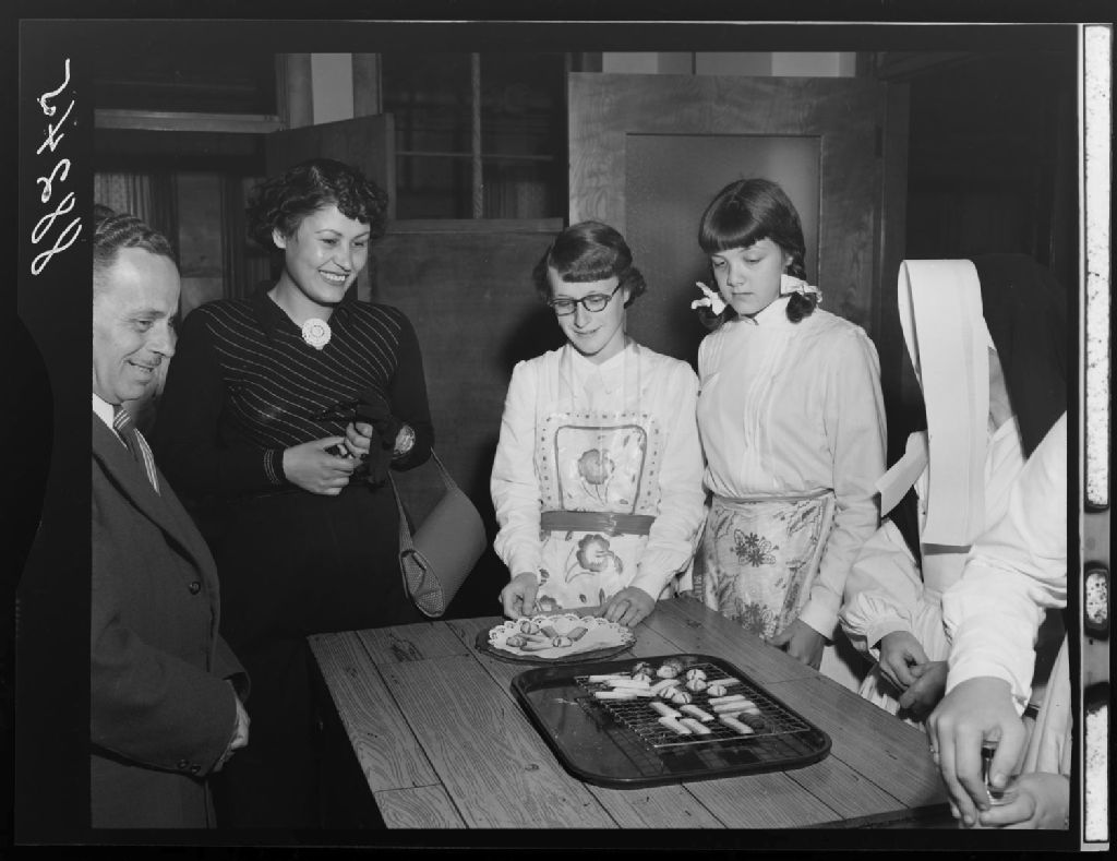 Classe de cuisine, mademoiselle Chamsi Mossaheb, une religieuse, monsieur Noël et deux élèves à l'École supérieure de Loretteville