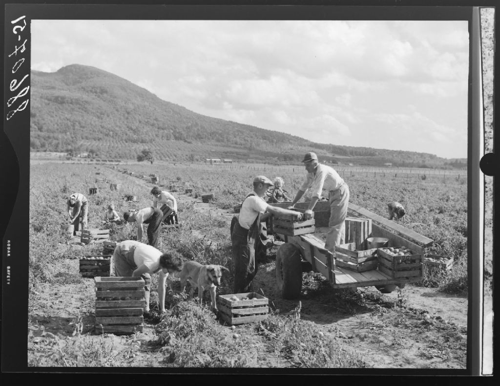 Récolte des tomates pour la conserverie chez Daniel Guertin. Saint-Jean-Baptiste-de-Rouville., 1951, Archives nationales à Québec, Fonds Ministère de la Culture et des Communications, (03Q,E6,S7,SS1,D2,P88607), Omer Beaudoin.