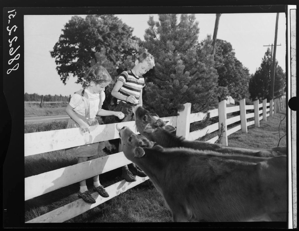 Enfants jouant avec des génisses type Jersey chez Ed. M. Detchon. Massawippi, comté Stanstead., 1951, Archives nationales à Québec, Fonds Ministère de la Culture et des Communications, (03Q,E6,S7,SS1,D2,P88622), Omer Beaudoin.