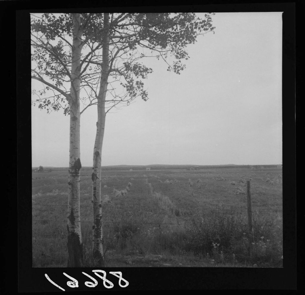 Les collines au loin derrière Saint-Augustin. Au premier plan, quelques peupliers faux trembles, à l'arrière une légère barre montagneuse. Affleurements rocheux derrière le village de Saint-Augustin, croupes molles allignées. Avant goût de la reprise définitive du plateau Laurentien septentrional dans les parages de Saint-Ludger-de-Milot. Sainte-Jeanne D'Arc, Lac Saint-Jean