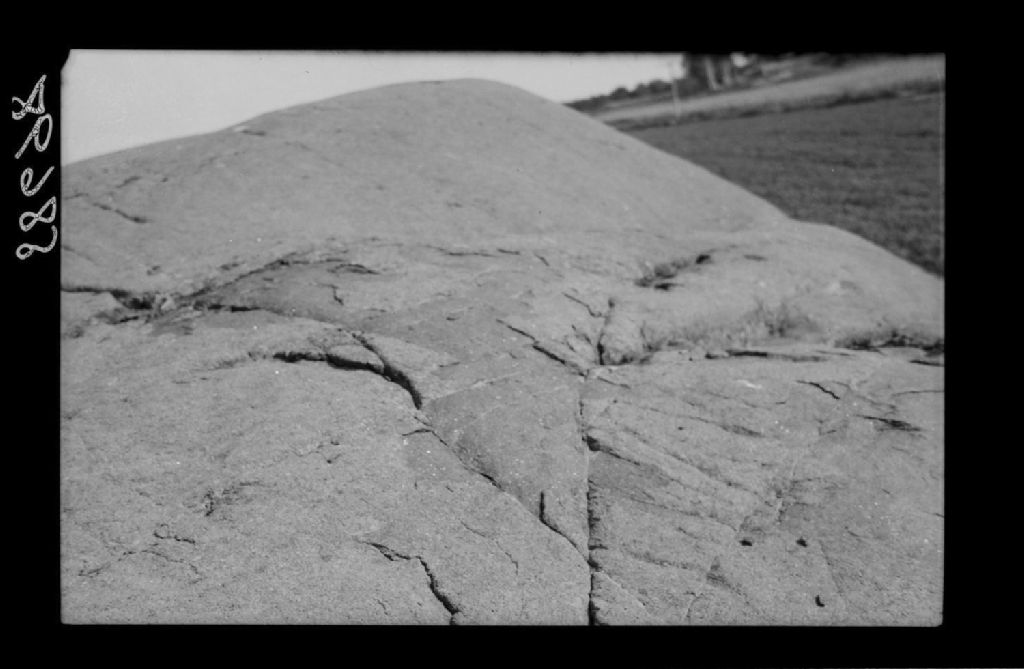 Desquamation sur un affleurement rocheux anorthositique. La roche se désagrège sous les effets de l'altération désagrégation et décomposition par exfoliation. Ainsi peuvent disparaitre les cannelures et les stries glaciaires mais le poli glaciaire semble se conserver. Voilà pourquoi les rayures du à la glace sont souvent absentes sur matériel feldsphatique, Saint-Bruno, Lac Saint-Jean