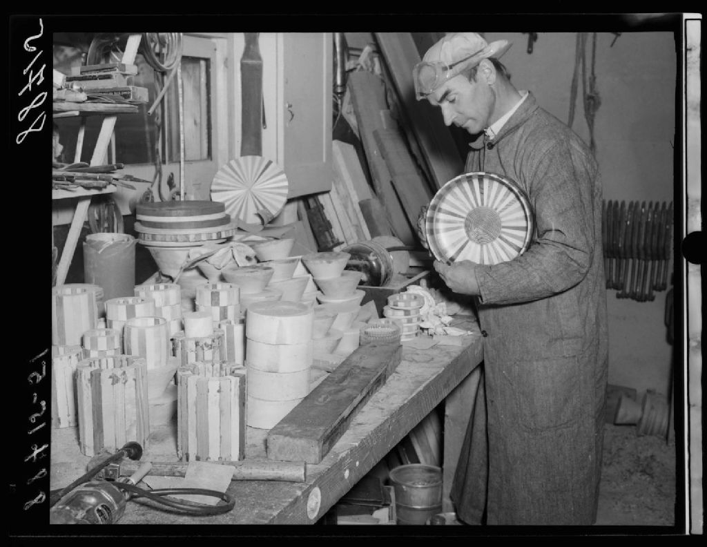 Atelier de marquetterie Henri Caron, L'Islet, 1951, Archives nationales à Québec, Fonds Ministère de la Culture et des Communications, (03Q,E6,S7,SS1,D2,P88715), J.W.Michaud.