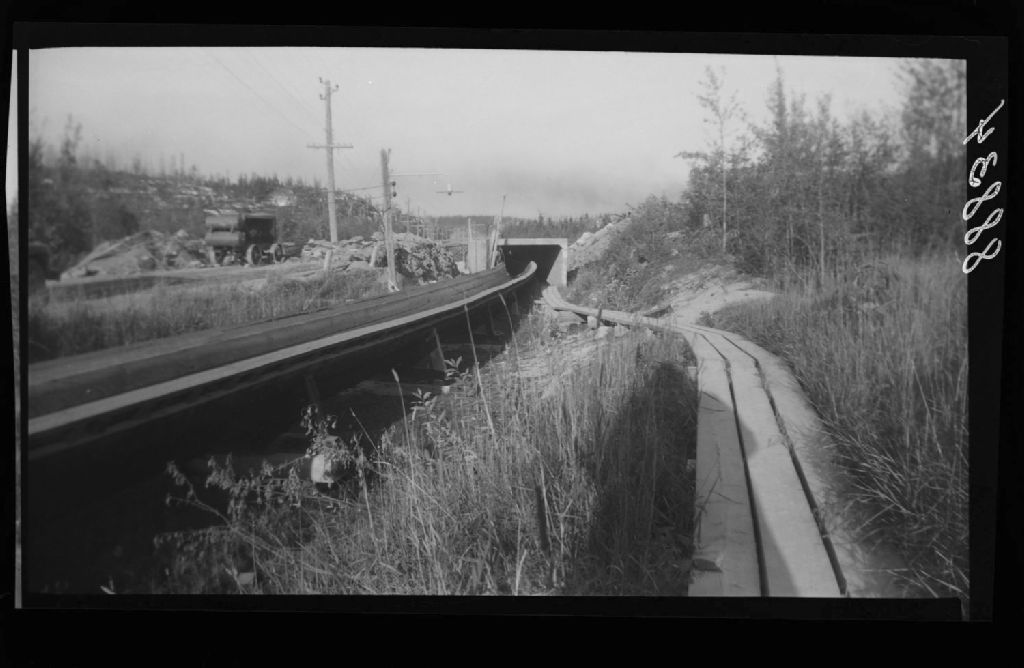 Ponceau en bois de 106 par 89 pieds au dessus de la dalle du Quebec North Shore & Paper Co. à Baie-Comeau, 1951, Archives nationales à Québec, Fonds Ministère de la Culture et des Communications, (03Q,E6,S7,SS1,D2,P88834), Jules Carbonneau.