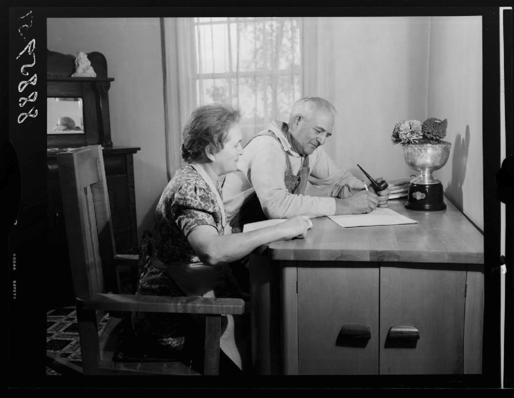 Monsieur et Madame Léon Guertin à la comptabilité. Granby, comté Shefford., 1951, Archives nationales à Québec, Fonds Ministère de la Culture et des Communications, (03Q,E6,S7,SS1,D2,P88859), Omer Beaudoin.