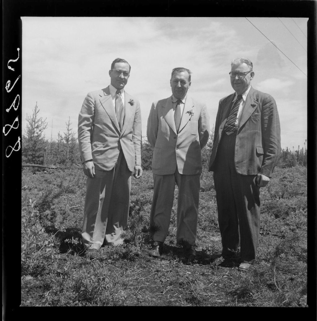 De Gauche: Fridolin Simard maire d'Amos, Stanislas Bégin sous-ministre de la Colonisation et Ernest Laforce président de la commission du service civil, Bayard, Abitibi est