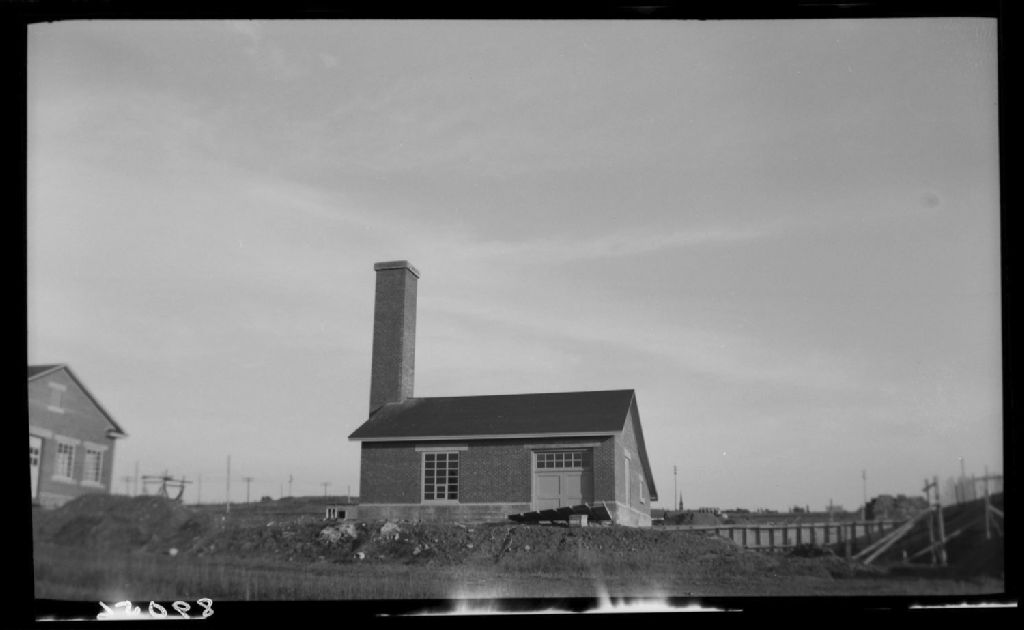 Chaufferie pour les bâtisses de la voirie à Mont-Joli. Comté de Matane, 1951, Archives nationales à Québec, Fonds Ministère de la Culture et des Communications, (03Q,E6,S7,SS1,D2,P89056), Robert Warren.