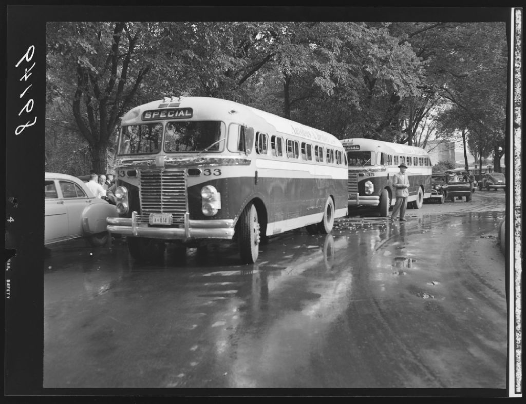 Départ des autobus pour le Club de chasse et pêche des employés civils à Saint-Urbain devant l'Assemblée nationale à Québec