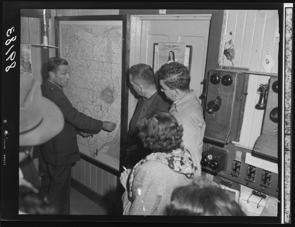 Monsieur Pagé, chef des gardes-forestiers, donnant quelques explications sur la prévention des incendies en forêt au Parc national, Station des gardes-forestiers