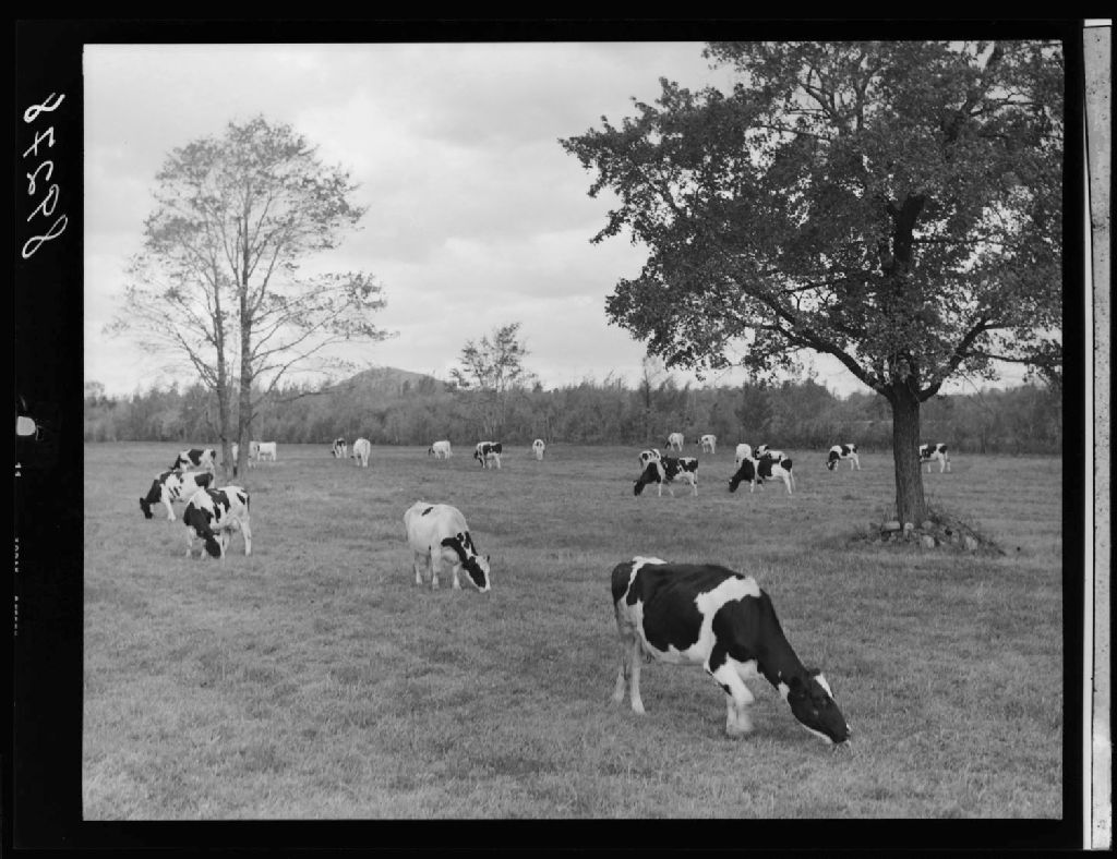 Troupeau Holstein au champ chez Sarto Charbonneau. Saint-Alexandre, Iberville., 1951, Archives nationales à Québec, Fonds Ministère de la Culture et des Communications, (03Q,E6,S7,SS1,D2,P89278), Omer Beaudoin.