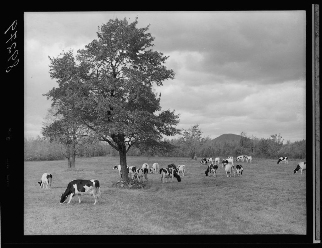Troupeau Holstein au champ chez Sarto Charbonneau. Saint-Alexandre, Iberville., 1951, Archives nationales à Québec, Fonds Ministère de la Culture et des Communications, (03Q,E6,S7,SS1,D2,P89279), Omer Beaudoin.