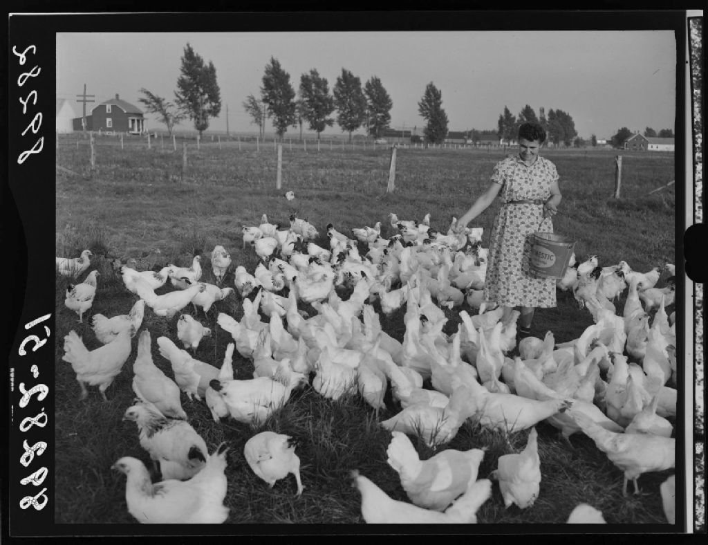Madame Émile Létourneau soigne ses poules type Leghorn Saint-Luc, comté Saint-Jean., 1951, Archives nationales à Québec, Fonds Ministère de la Culture et des Communications, (03Q,E6,S7,SS1,D2,P89282), Omer Beaudoin.