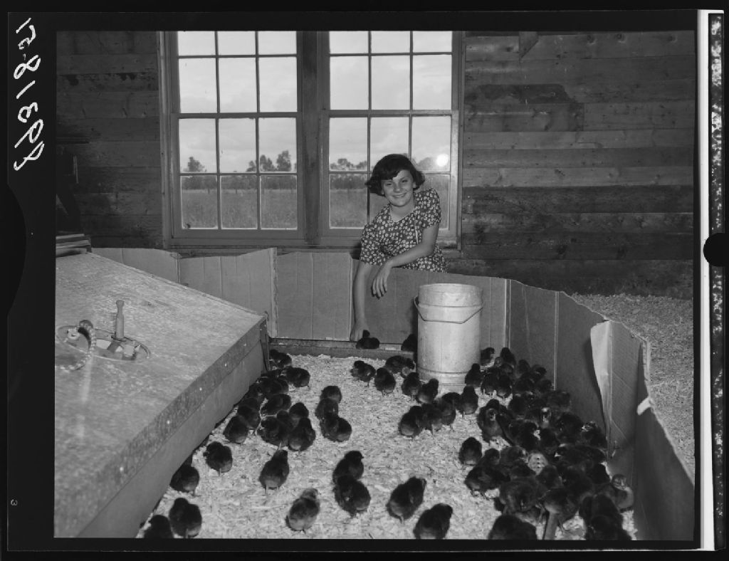 Fillette et poussins en éleveuse chez Hertel Rouillier. Chambly-Bassin., 1951, Archives nationales à Québec, Fonds Ministère de la Culture et des Communications, (03Q,E6,S7,SS1,D2,P89318), Omer Beaudoin.