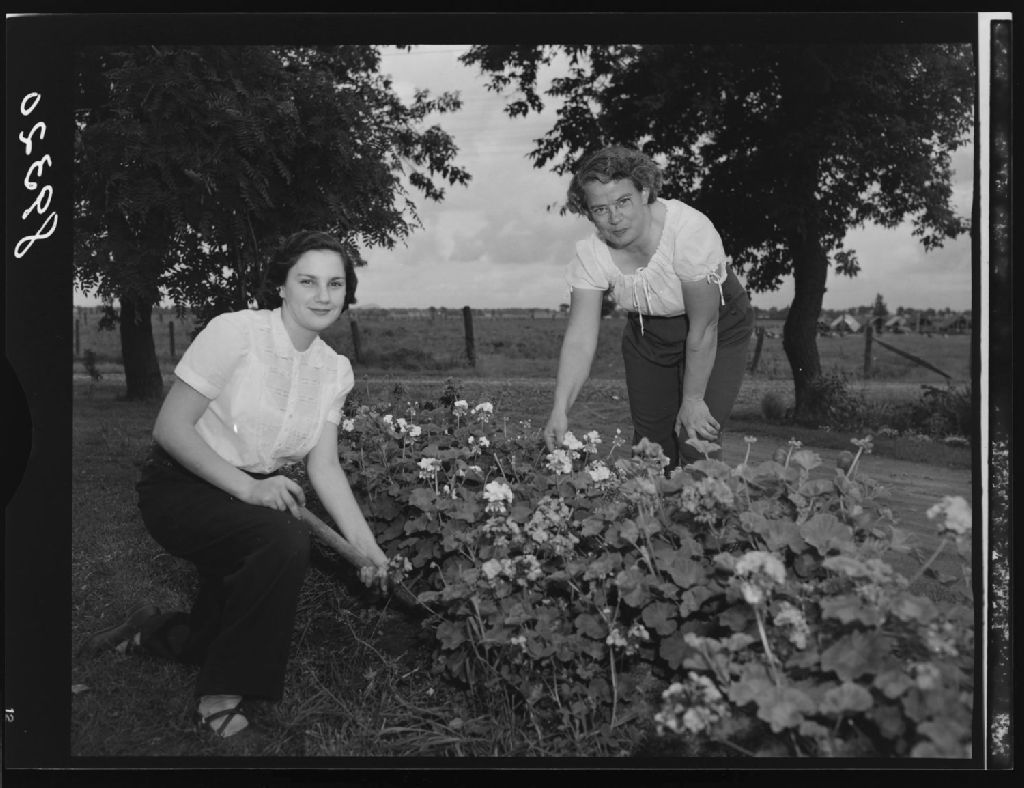 Madame et Mlle Rouillier travaillant sur plate-bande. Chez Hertel Rouillier à Chambly-Bassin., 1951, Archives nationales à Québec, Fonds Ministère de la Culture et des Communications, (03Q,E6,S7,SS1,D2,P89320), Omer Beaudoin.