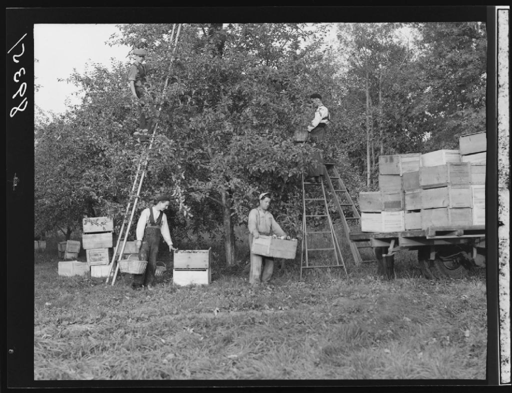Groupe de frères à la récolte de pommes. Chez les Frères de Saint-Gabriel, à Saint-Bruno.