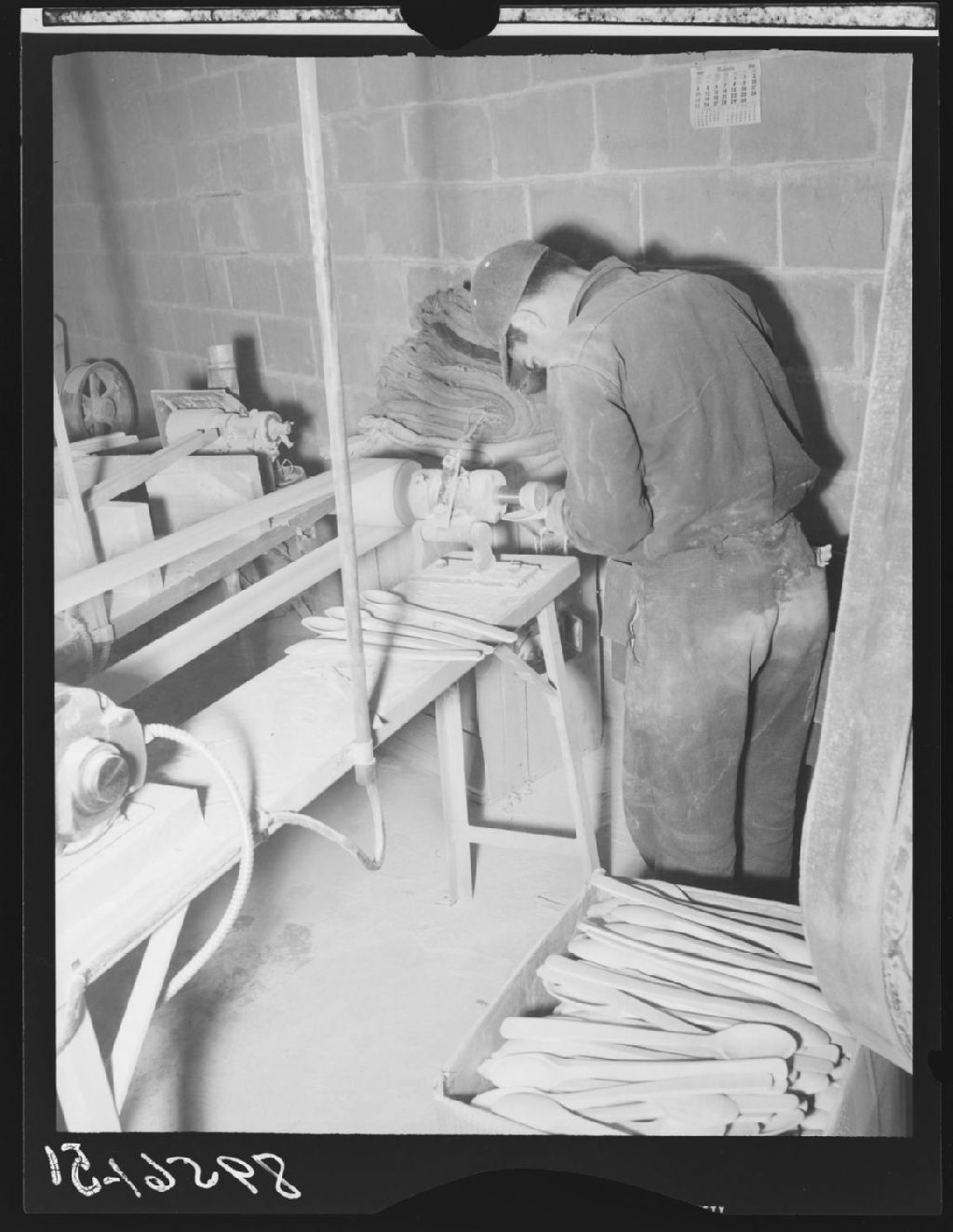 Sablage des cuillères à mélanger. Le sablage intérieur des cuillères à mélanger type "Libby" éxige un outillage spécial, si on veut obtenir un fini lisse et uniforme. C'est un spécialité des Industries Baribeau Inc. à Lévis