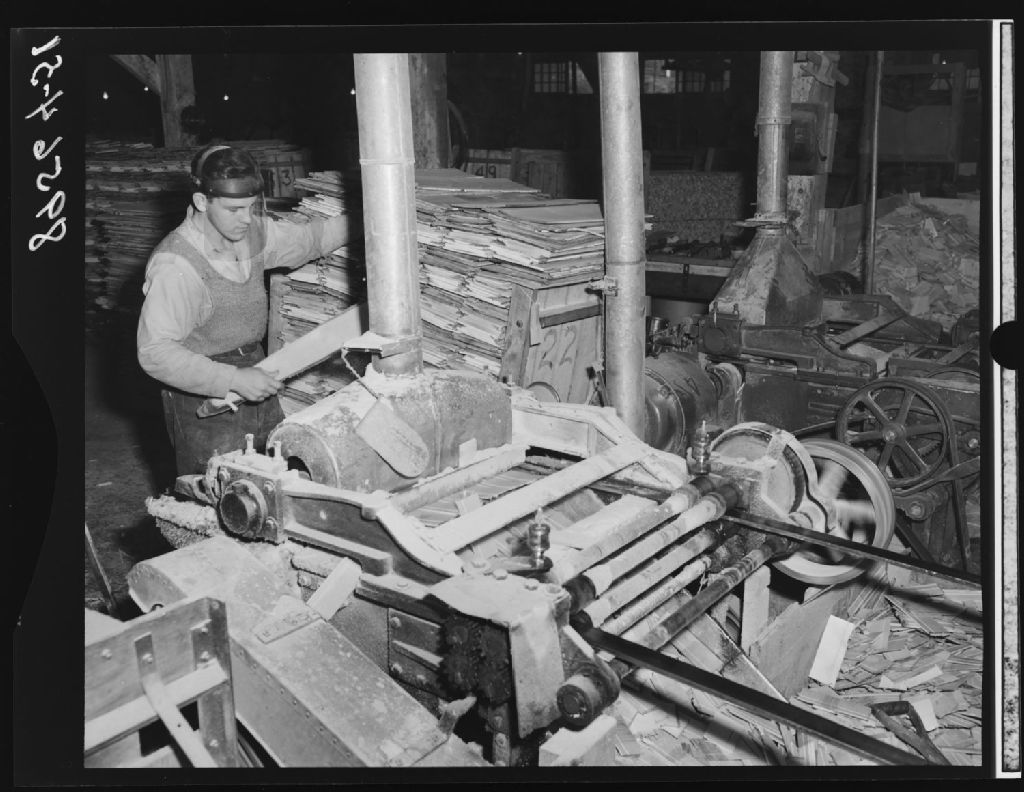 Fabrication des épingles à linge. Deux machines à rainures (grooves) sont employées pour la fabrication des épingles à linge à ressort. au Industrie Baribeau Inc, Lévis
