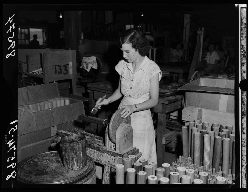 Application du vernis hermétique sur les rouleaux à pâte. Le vernissage des rouleaux à pâte leur assure une imperméabilité et un fini de qualité. Industries Baribeau Inc, Lévis, 1951, Archives nationales à Québec, Fonds Ministère de la Culture et des Communications, (03Q,E6,S7,SS1,D2,P89574), Neuville Bazin.