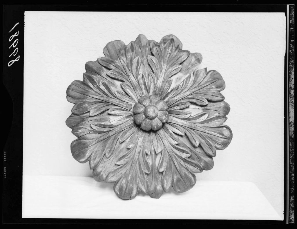 Rosace sculptée en pin de 24 pouces de diamètre à motif des feuilles d'acanthe. Provenant de l'église de Sainte-Elizabeth. Musée du Québec, 1951, Archives nationales à Québec, Fonds Ministère de la Culture et des Communications, (03Q,E6,S7,SS1,D2,P89981), Neuville Bazin.