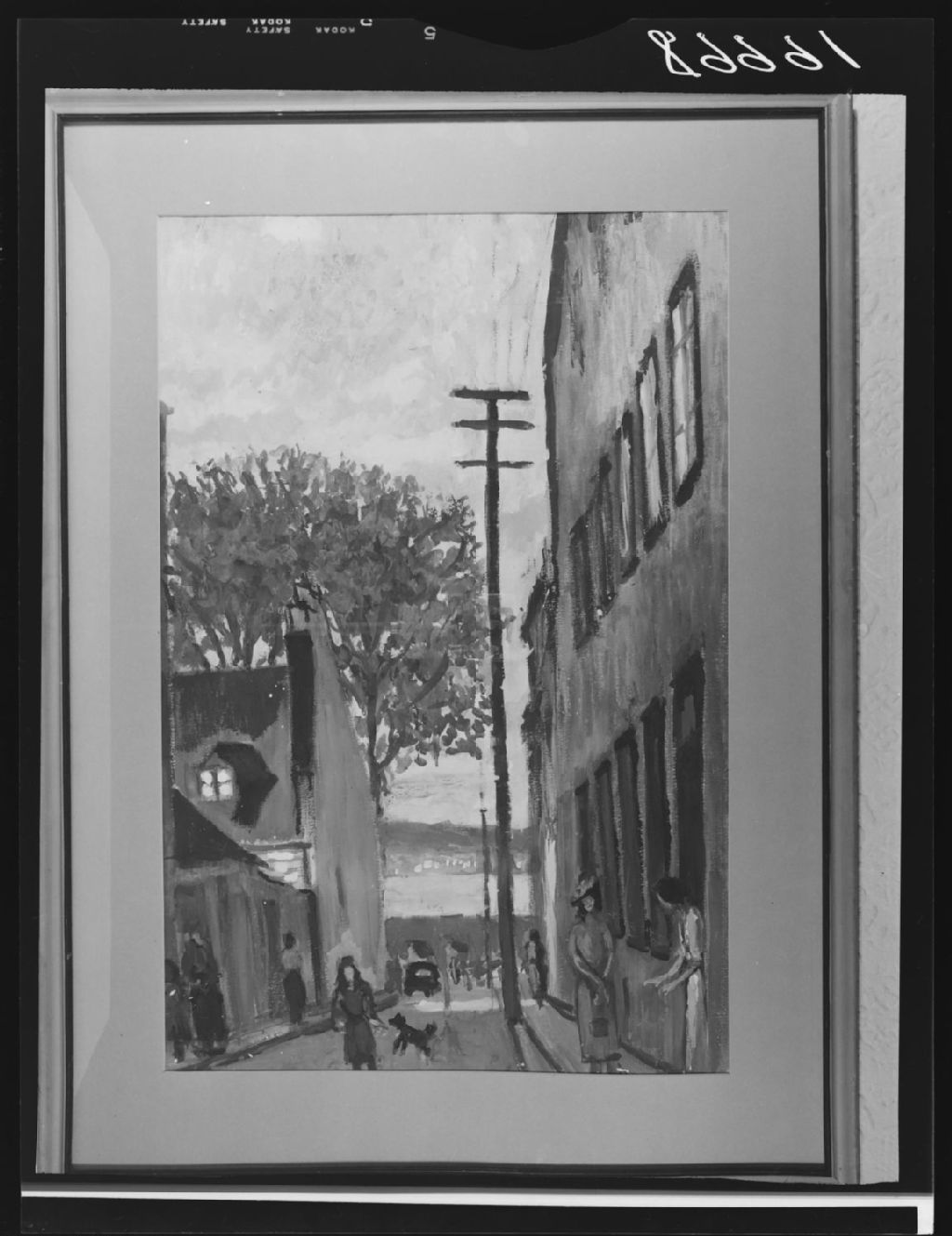 Rue Saint-Flavien, Québec par Jean Tyschiewitz. Musée du Québec, 1951, Archives nationales à Québec, Fonds Ministère de la Culture et des Communications, (03Q,E6,S7,SS1,D2,P89991), Neuville Bazin.