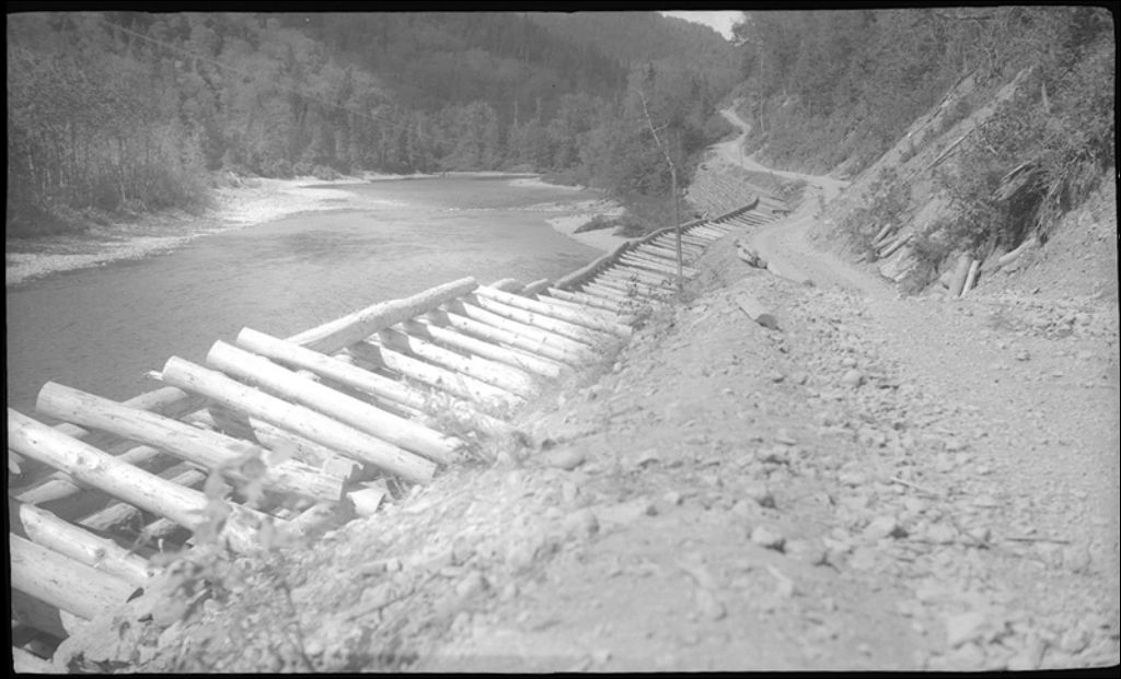 Mur de soutènement pendant la construction, 1942, Archives nationales à Québec, Fonds Ministère de la Culture et des Communications, (03Q,E6,S7,SS1,D2,P9808), W. Dumont.