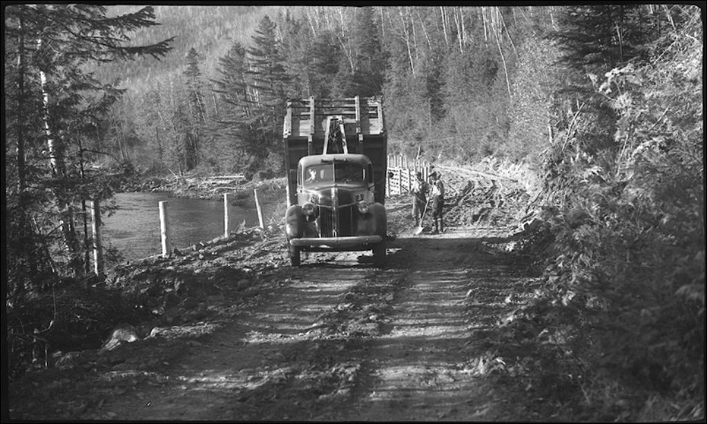 Mur de soutènement au 23e mille pendant la construction, 1942, Archives nationales à Québec, Fonds Ministère de la Culture et des Communications, (03Q,E6,S7,SS1,D2,P9813), W. Dumont.