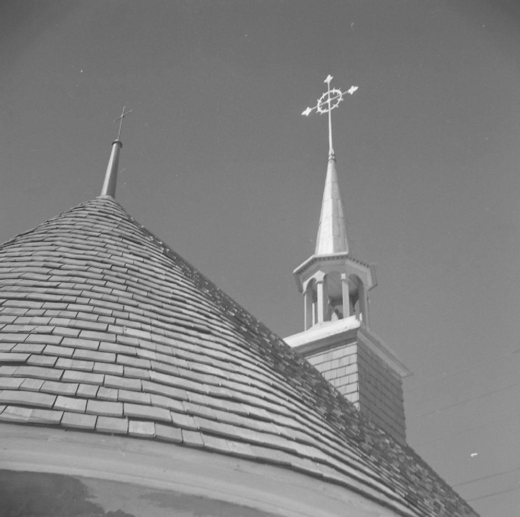 Beaumont, Bellechasse - Chapelle de procession, Clocher et Croix, 1957, Archives nationales à Québec, Fonds ministère de la Culture et des Communications, (03Q,E6,S8,SS1,SSS103,D317), Photographe non identifié.