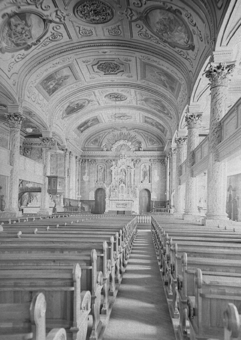 Bonaventure, Bonaventure - Église - Intérieur décoré par Dorval (1896), Vers 1950, Archives nationales à Québec, Fonds ministère de la Culture et des Communications, (03Q,E6,S8,SS1,SSS152,D677), Pas de mention de responsabilité.